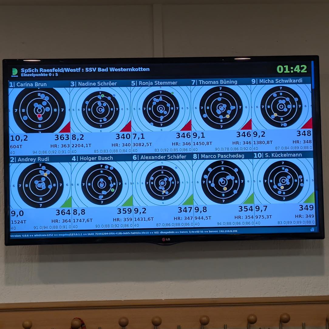Unsere Sportlerinnen und Sportler des SSV Bad Westernkotten konnten mit einem knappen 3:2 ihr Match gegen die SpSch Pier gewinnen. Peter Müller (SSVBWK) gewann an Position eins mit 376:373 Ringen gegen Markus Kremser (Pier), ebenso wie Gregor Luetkevedder (SSVBWK) mit 379:374 Ringen gegen Robin Januszek (Pier) und Ralf Risse an Position fünf gegen Anne-Marlen Ohler (Pier) mit 367:362 Ringen. Hanna Levkovska und Sascha Düsing unterlagen ihren Gegnern.